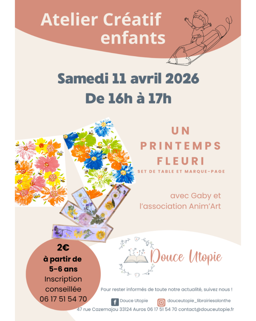 Douce Utopie – Atelier créatif Accueil / Agenda des manifestations / Date samedi 11 avril 2026 Horaires 16h00 - 17h00