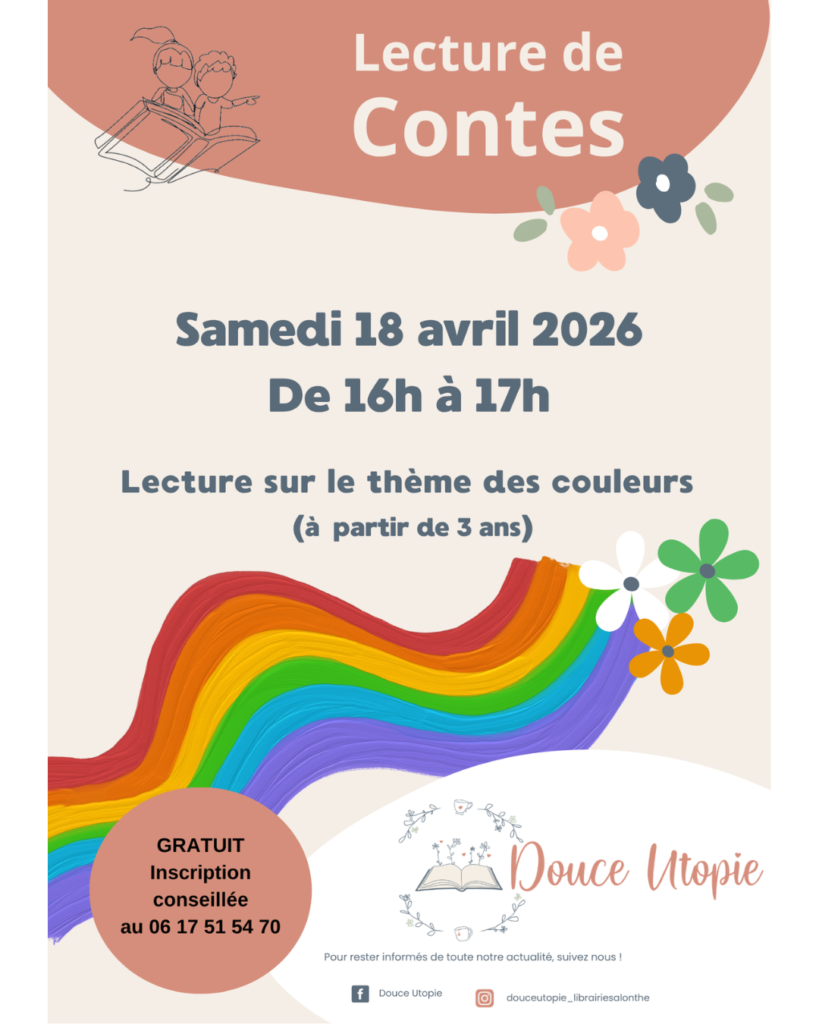 Douce Utopie – Lecture de contes Accueil / Agenda des manifestations / Date samedi 18 avril 2026 Horaires 16h00 - 17h00