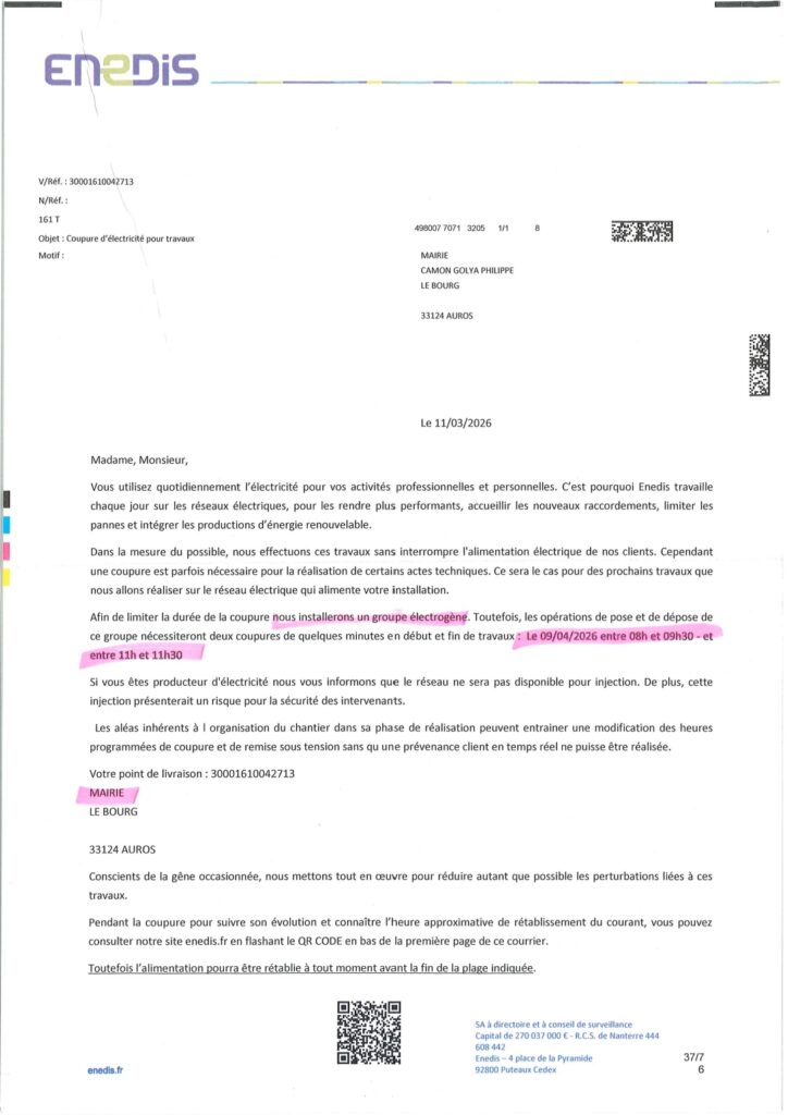 Ces coupures ne dureront que quelques minutes sur les plages horaires indiquées conformément au courrier ENEDIS ci-dessous.